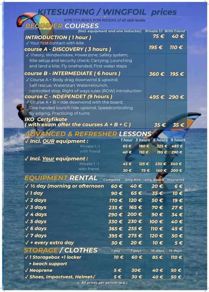We provide all the equipment you need for a successful session, including wings, boards and safety equipment. You can bring your own equipment or rent from our selection.